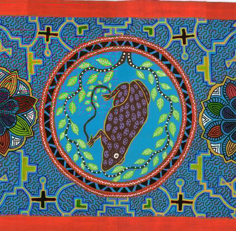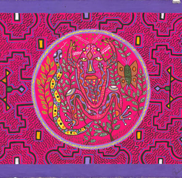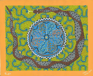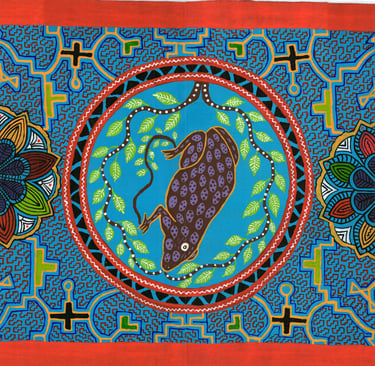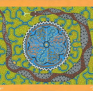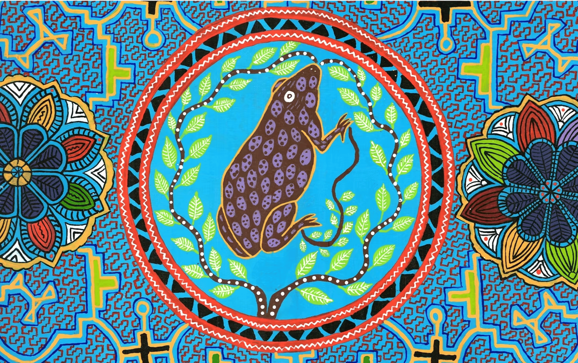 Often used in ceremony, the powerful secretions of the Sapo facilitate great visions for the experienced Maestro and his pasajeros. Framed within complex Kené represents the skin of the majestic Anaconda, and forms a central theme to the origin story of the Shipibo People.