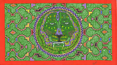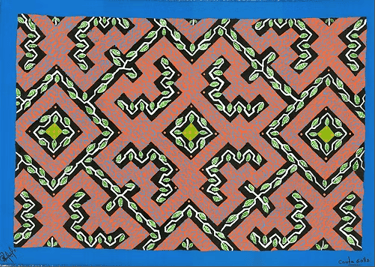 Created in traditional Kené style, the artist combines geometry with natural plant elements within this powerful composition. The interpretation is personal to each participant, through his work, a space for healing on the physical, mental, emotional, and spiritual planes is offered. Used in ceremony and focused energy work, these Kené patterns are an intrinsic part of Shipibo tribal life.