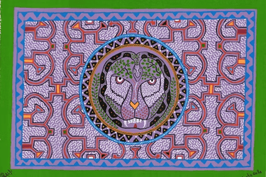 Known as the spirit protector of the rainforest, the mighty Jaguar is revered and honored by the Shamans and the people of the Amazon. As a gatekeeper to the ‘unknown’ the mystical powers of the Otorongo awaken the inner core of those it protects and guides. The artists introduction of complex geometric patterns bind the composition in rich and vibrant pallet.