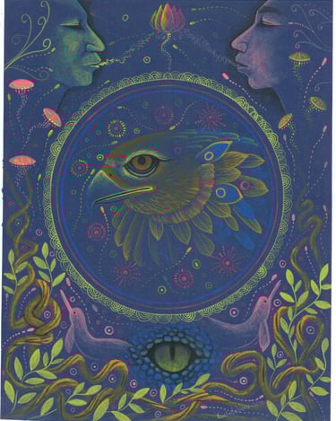 A journey through traditional ceremonial songs (icaros) is communicated through this canvas. Emerging and transforming, the hummingbird acts as companion to the shaman, elevating the senses and sensations he experiences.