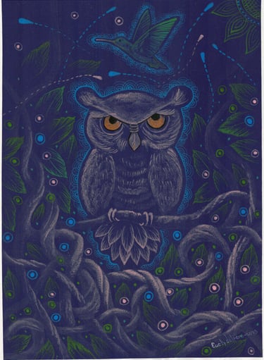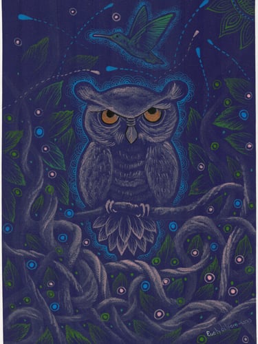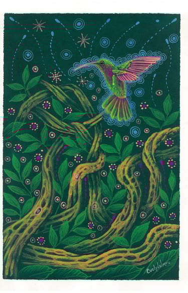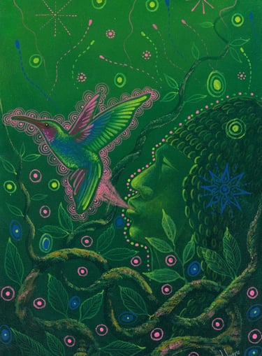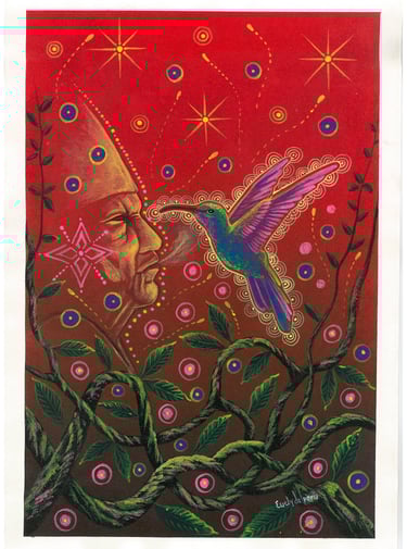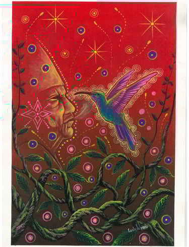 A visionary canvas uniting the hummingbird within the sacred vines and leaves of ayahuasca. The bird represents the movement through challenge, symbolic of our own personal journey in life. This piece evokes healing energy and vibration.