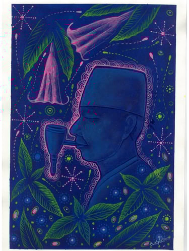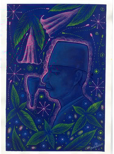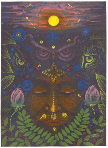 A powerful and highly revered plant medicine, the relationship between the maestro and the Chacruna is illustrated in this work. As a spiritual connector, we see the intrinsic and intimate unity of the shaman and his plant teacher.