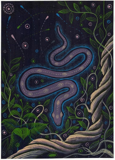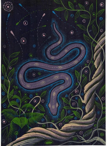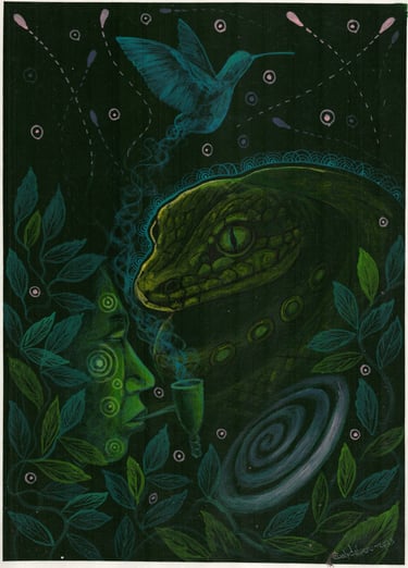 Representing the 'world-view' of the Shaman, the primordial Anaconda is invoked for her serpentine energy and is an animal representation of the plant medicine surrounding her.