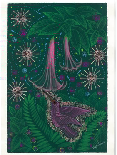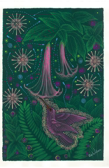 The transformation of movement into sound is illustrated through the spiritual symbolism of the hummingbird. She is seen here uniting with the jungle flora and is surrounded by the visions of the artist.