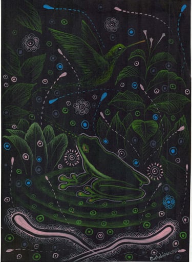 A journey through traditional ceremonial songs (icaros) is communicated through this canvas. Emerging and transforming, the hummingbird acts as companion to the shaman, elevating the senses and sensations he experiences.