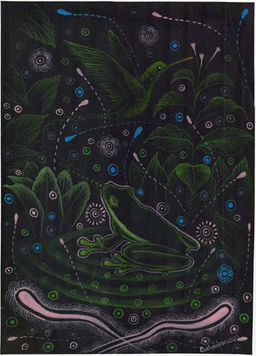 A magic song unfolds upon this canvas as the artist explores the Maestro's connection to this spiritual realm through the vibration of sound. “Medicine songs” or Icaros, have been a powerful part of traditional shamanic culture and healing for millennia. The frog here acts as a bridge between these worlds.